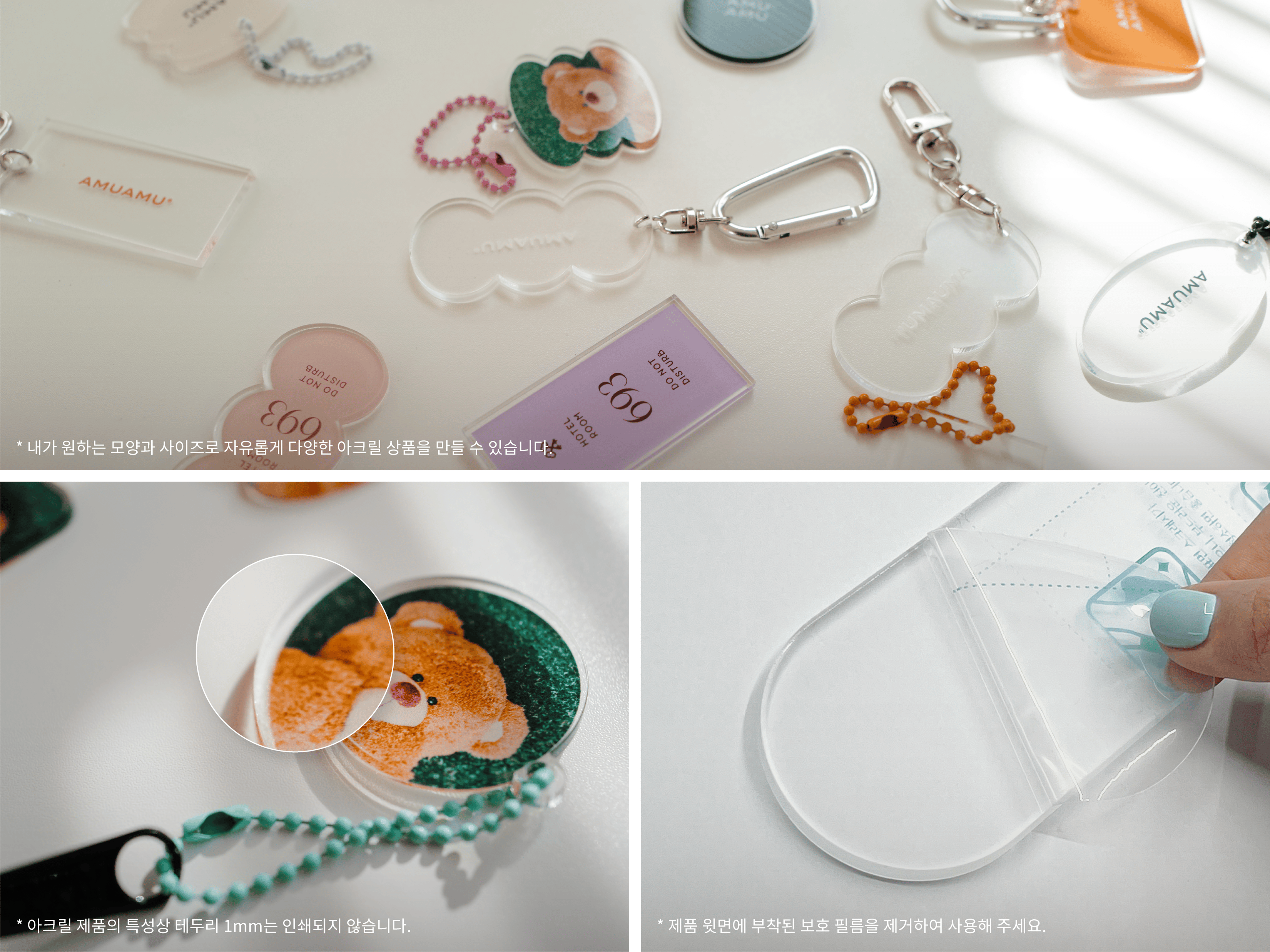 ・투명한 아크릴 뒷면에 인쇄하는 배면 인쇄 방식으로, 화이트인쇄를 더해 앞면의 디자인이 더욱 선명하게 보입니다. ・아크릴 뒷면에 인쇄되는 제작 특성상 뒷면에서 확인할 경우 이미지의 좌우가 반전되어 보여집니다.
