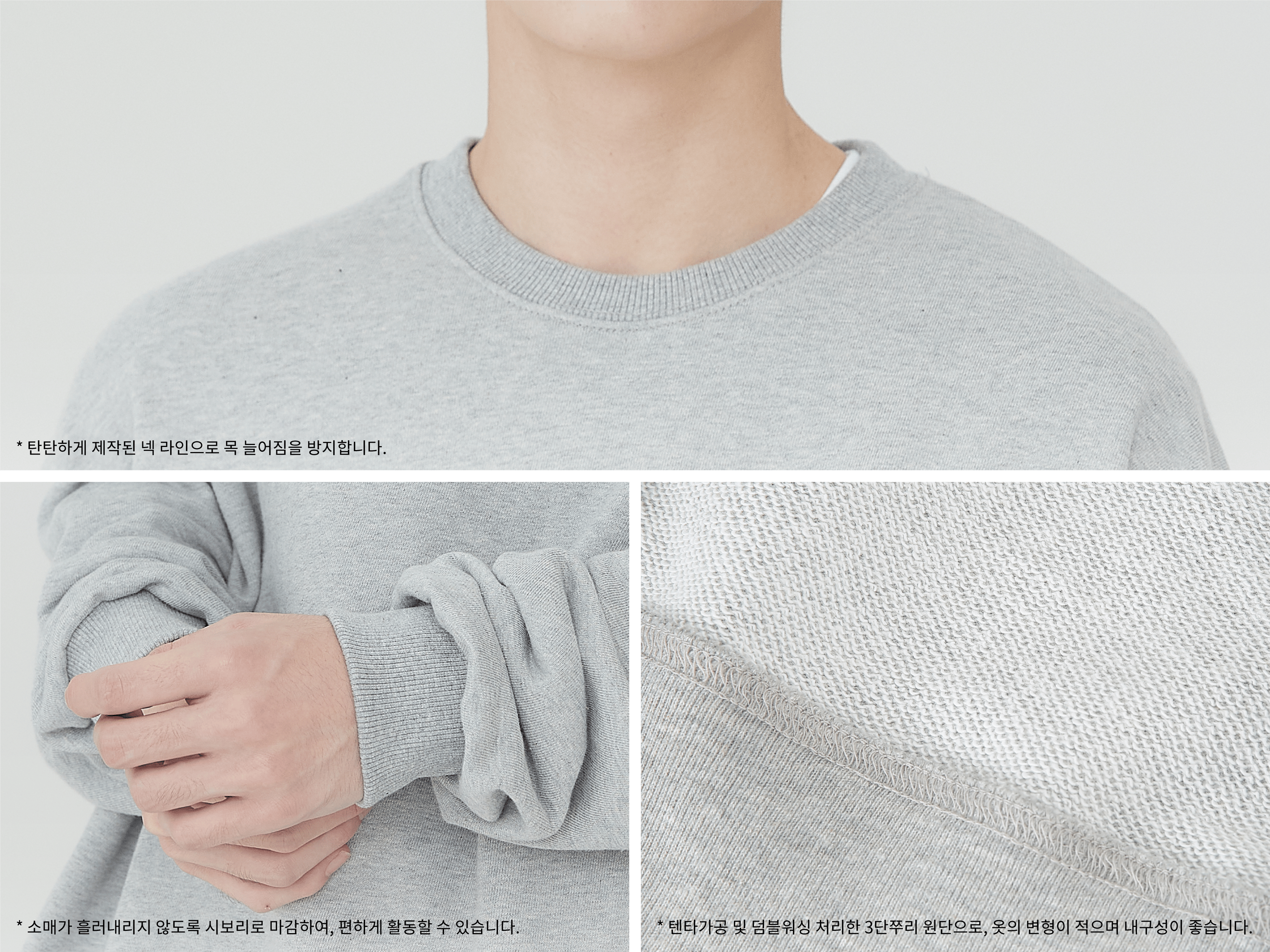 ・쭈리 원단: 부드러운 원단이 특징이며, 원단 뒷면이 작은 루프 형태로 짜여 있어 통기성이 높고, 내구성이 좋습니다. ・기모 원단: 원단 뒷면에 기모 공정을 하여, 부드럽고 도톰한 두께감을 만들어 따뜻하게 입을 수 있습니다.