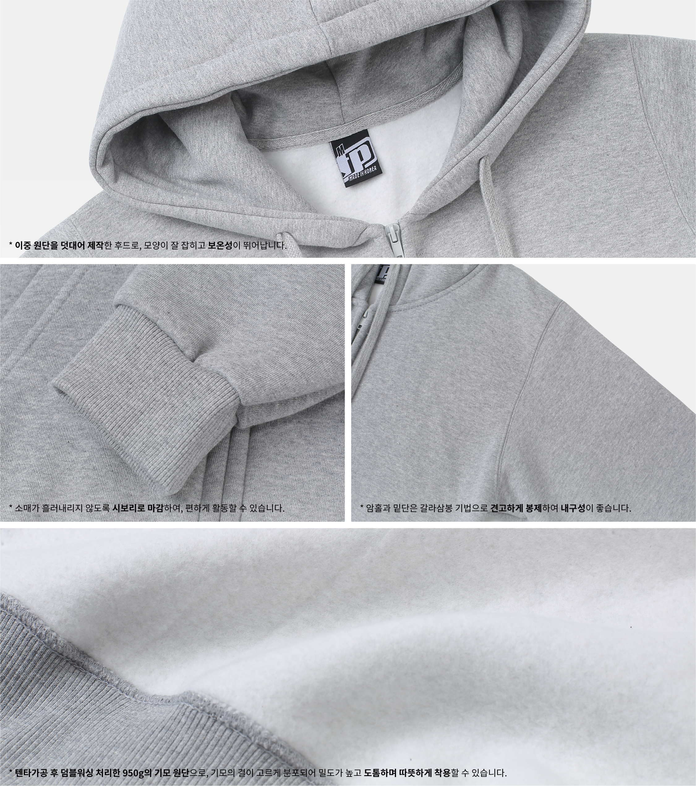 - 일반 기모 제품보다 더 도톰한 950g 중량으로 제작되어 포근하고 따뜻해요. 국내에서 생산된 프리미엄 기모 원단에 핏감을 좋게 만드는 견고한 봉제로 튼튼하며, 여유로운 핏감으로 캐주얼하게 착용할 수 있어요. 텐타가공 및 덤블워싱 공정을 거쳐 내구성을 높여, 변형과 수축이 적은 후드 집업입니다.