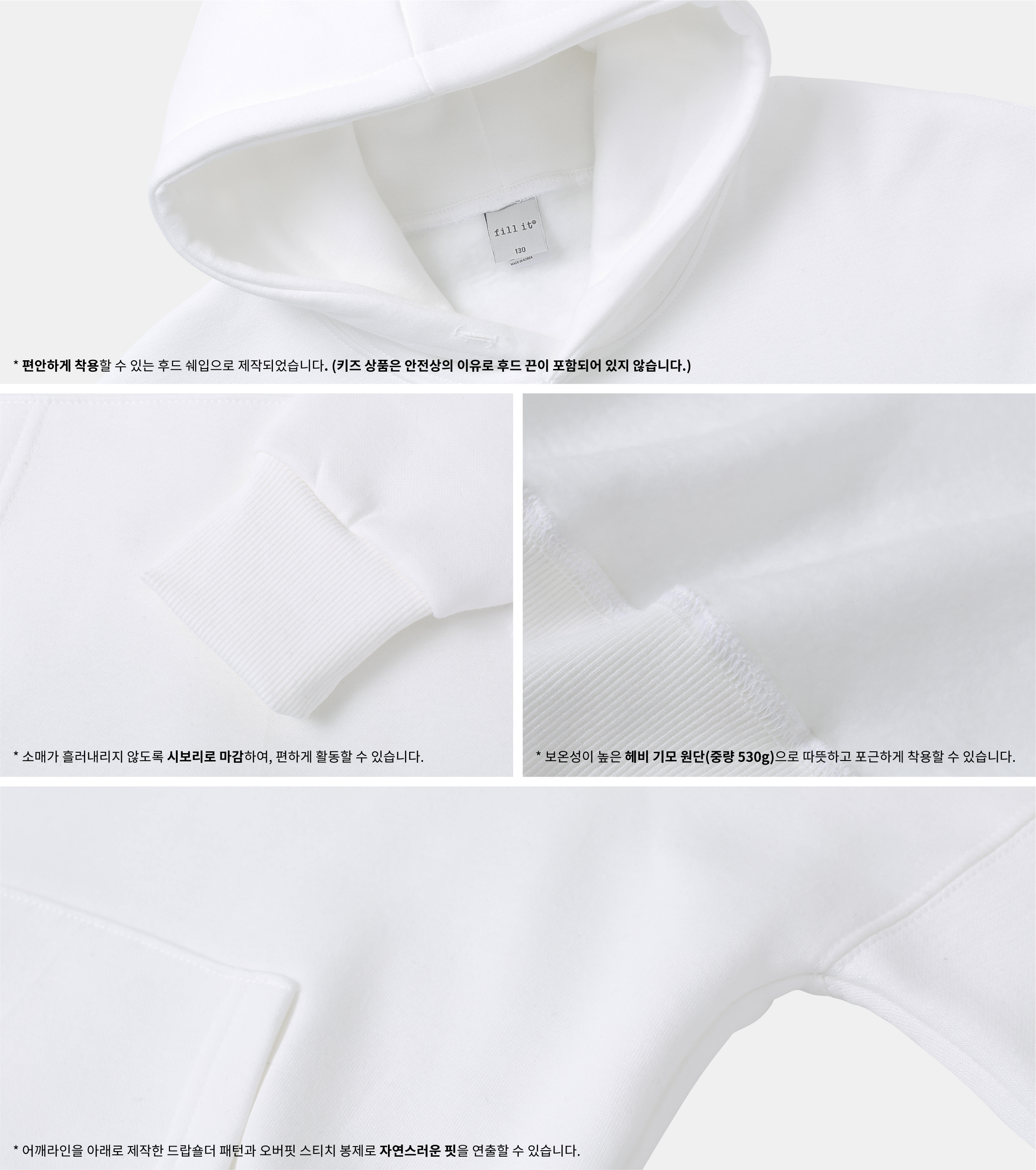 - 포근하고 따뜻한 착용감을 가진 필잇 시그니처 겨울 후드입니다. 국내에서 생산된 헤비 기모 원단 530g 중량으로 제작되어 탄탄하고 부드러워요. 어깨선이 아래로 내려와 루즈한 핏으로 자연스럽고 캐주얼하게 입을 수 있으며, 다양한 색상과 사이즈로 구성되어 있어요.
