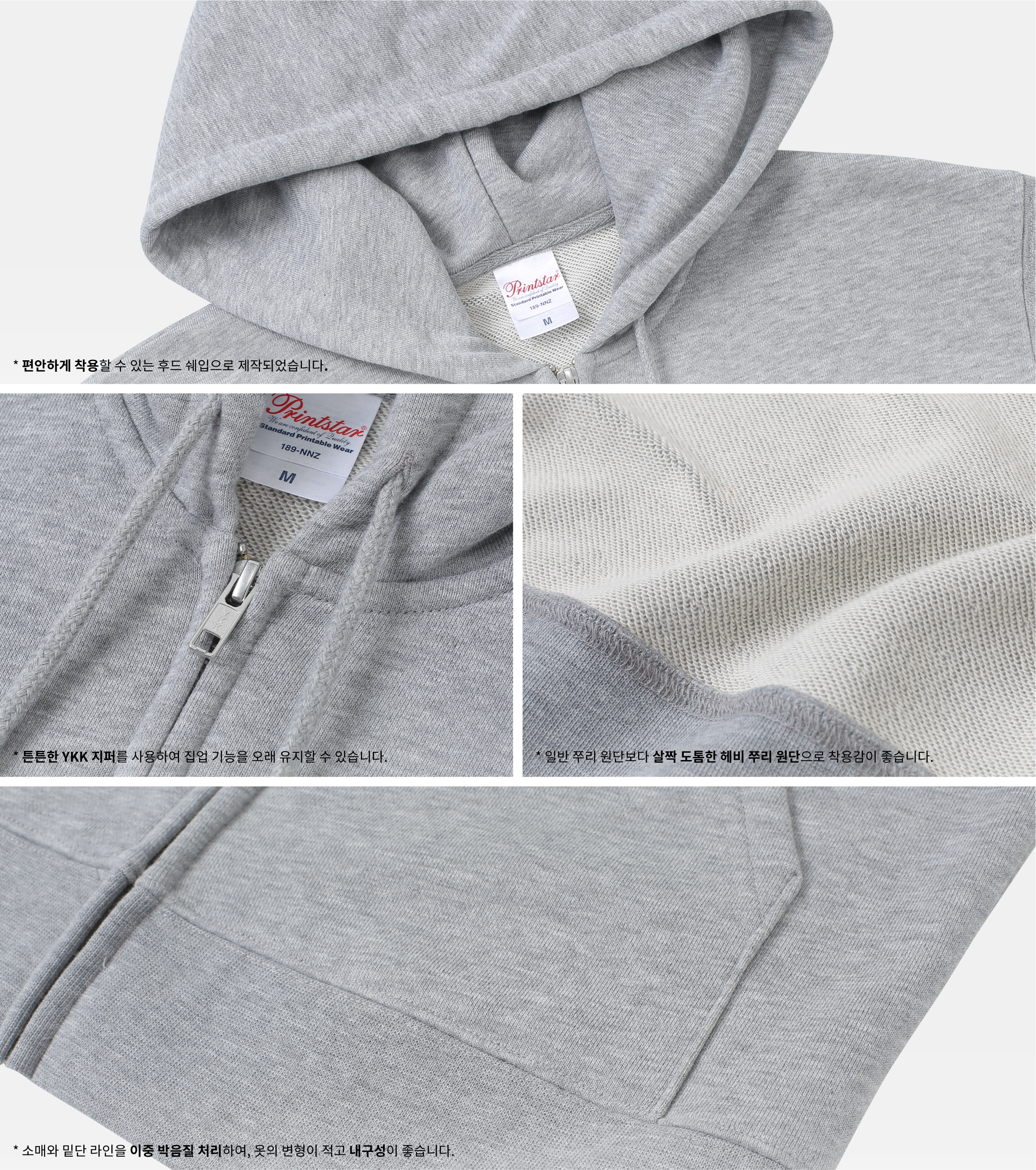 - 일반 후드의 쭈리 원단이 가볍고 힘이 없다고 느껴졌다면, 헤비 쭈리로 제작된 프린트스타 헤비 후드를 살펴보세요. 부드러운 면 100% 원단과 살짝 도톰하게 느껴지는 두께감으로 든든하게 입을 수 있어요. 튼튼한 YKK 지퍼를 사용하여 내구성까지 갖춘 베이직 아이템입니다.