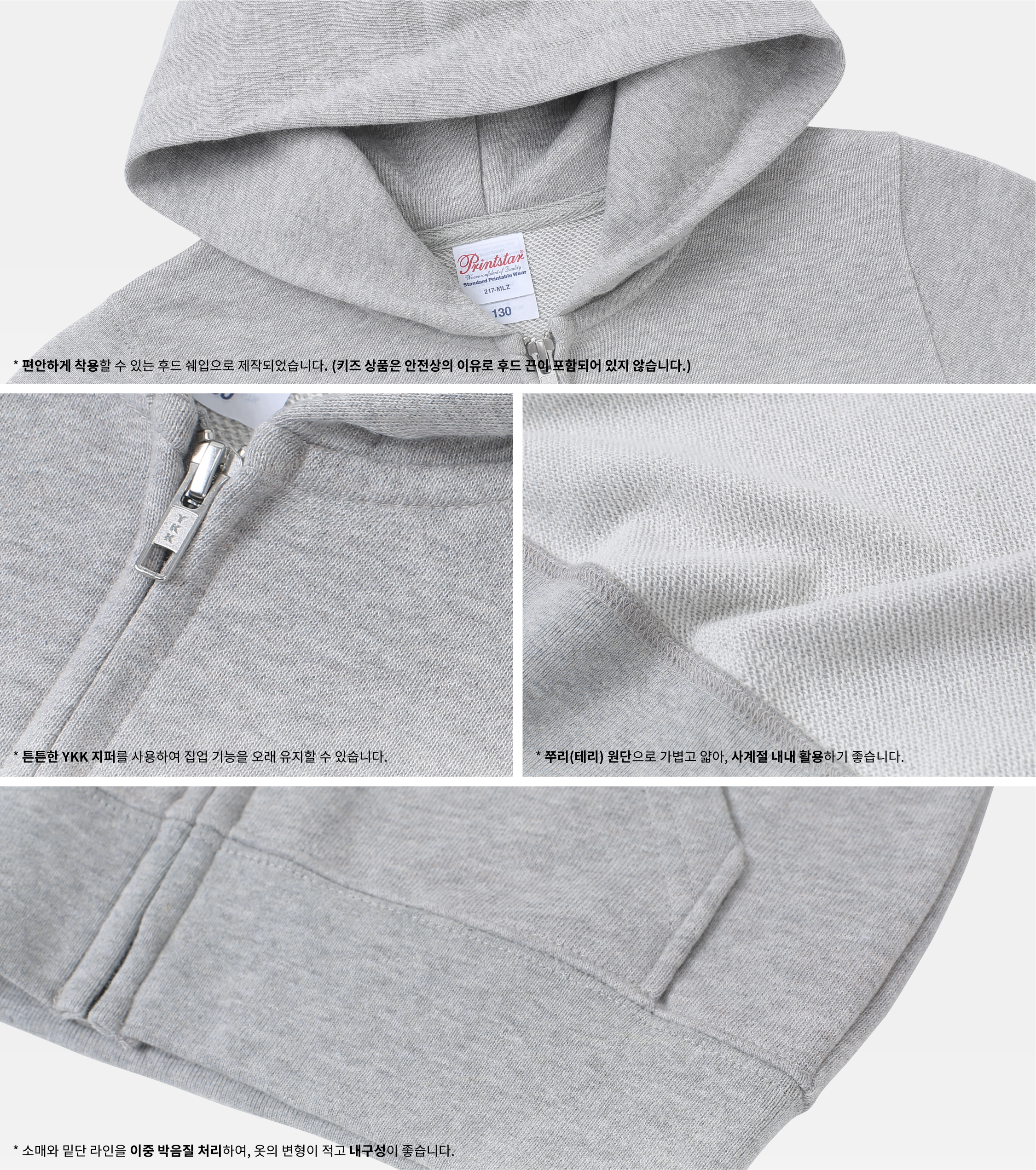 - 가볍고 얇은 두께감으로 사계절 내내 활용하기 좋은 프린트스타 후드 집업입니다. 부드러운 면 100% 원단과 튼튼한 YKK 지퍼를 사용하여 편안함과 내구성을 모두 갖췄어요. 깔끔한 스탠다드핏과 베이직한 디자인으로 어떤 옷과도 자연스럽게 어울려, 활동성과 스타일을 동시에 갖춘 꾸안꾸룩을 연출할 수 있어요.