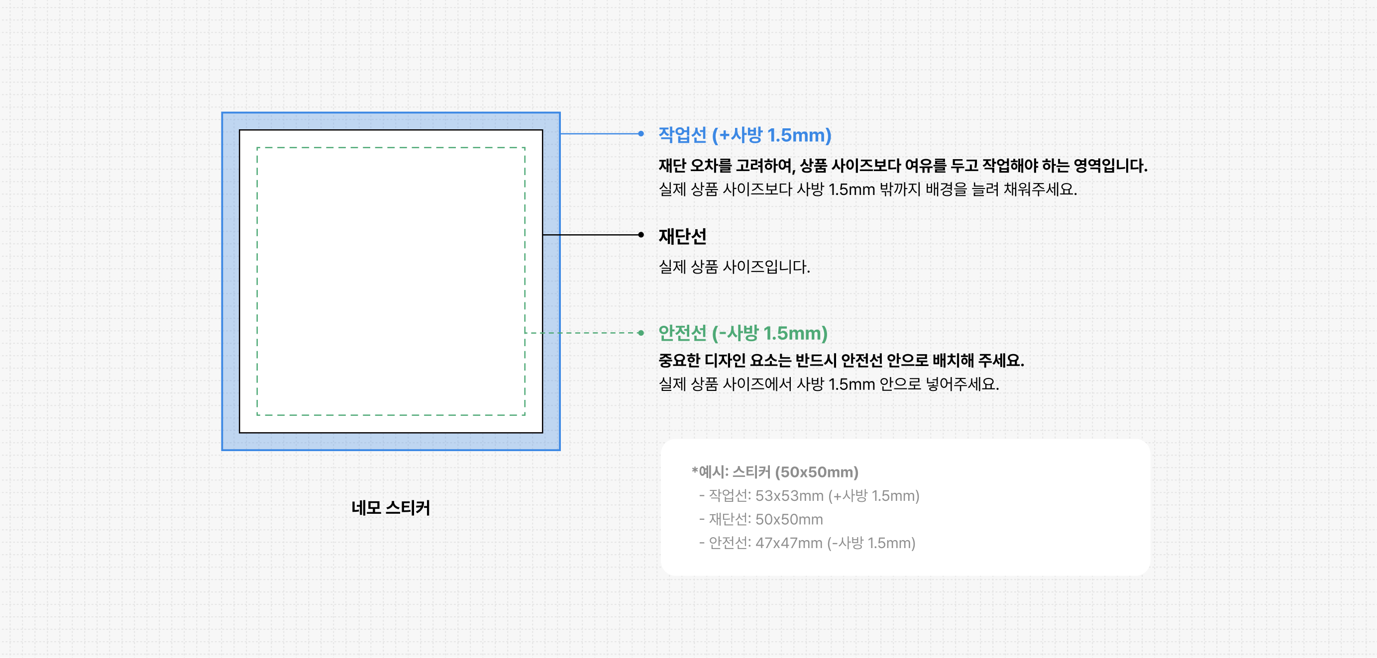・안전선: 글씨나 이미지가 잘려 나가지 않는 최소한의 안전한 영역으로, 중요한 디자인 요소는 반드시 안전선 안으로 배치해 주세요. ・안전선 밖으로 디자인할 경우, 재단 오차에 의해 잘려 나갈 수 있습니다. ・해당 유의사항을 확인하지 않고 발생하는 디자인 실수에 대해서는 재작업 및 반품이 불가합니다.
