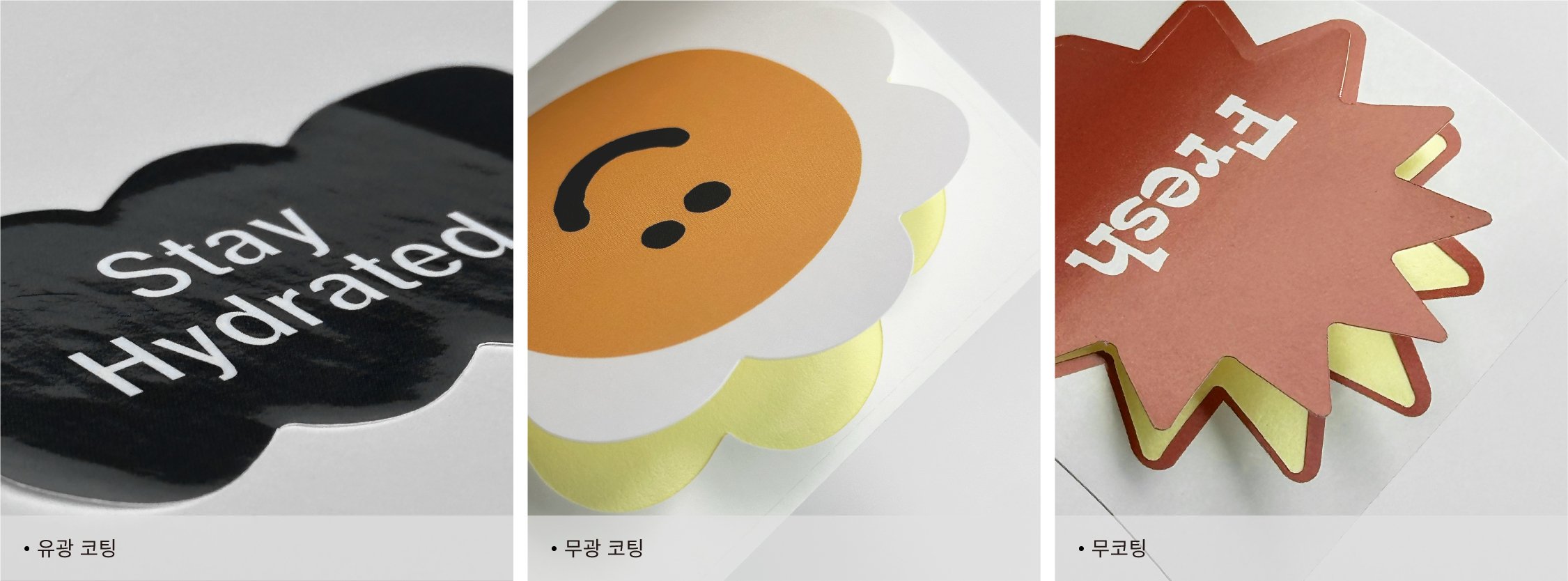 ・유광 코팅 아트지: 표면이 매끄럽고 잘 찢어지지 않으며, 색상이 또렷하게 표현됩니다. ・무광 코팅 아트지: 광택이 없어 차분하고 고급스러운 느낌을 주며, 부드러운 색상 표현이 가능합니다. ・무코팅 아트지: 종이 본연의 질감이 살아 있어 색상이 자연스럽게 표현됩니다.