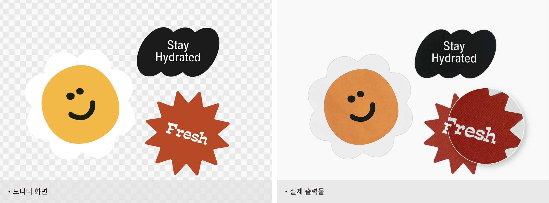 - 프린팅 방식과 상품 원단에 따라, 인쇄 후 모니터 화면과 실제 출력물의 색상 차이가 발생할 수 있으며 이에 대한 교환 또는 환불은 불가합니다.