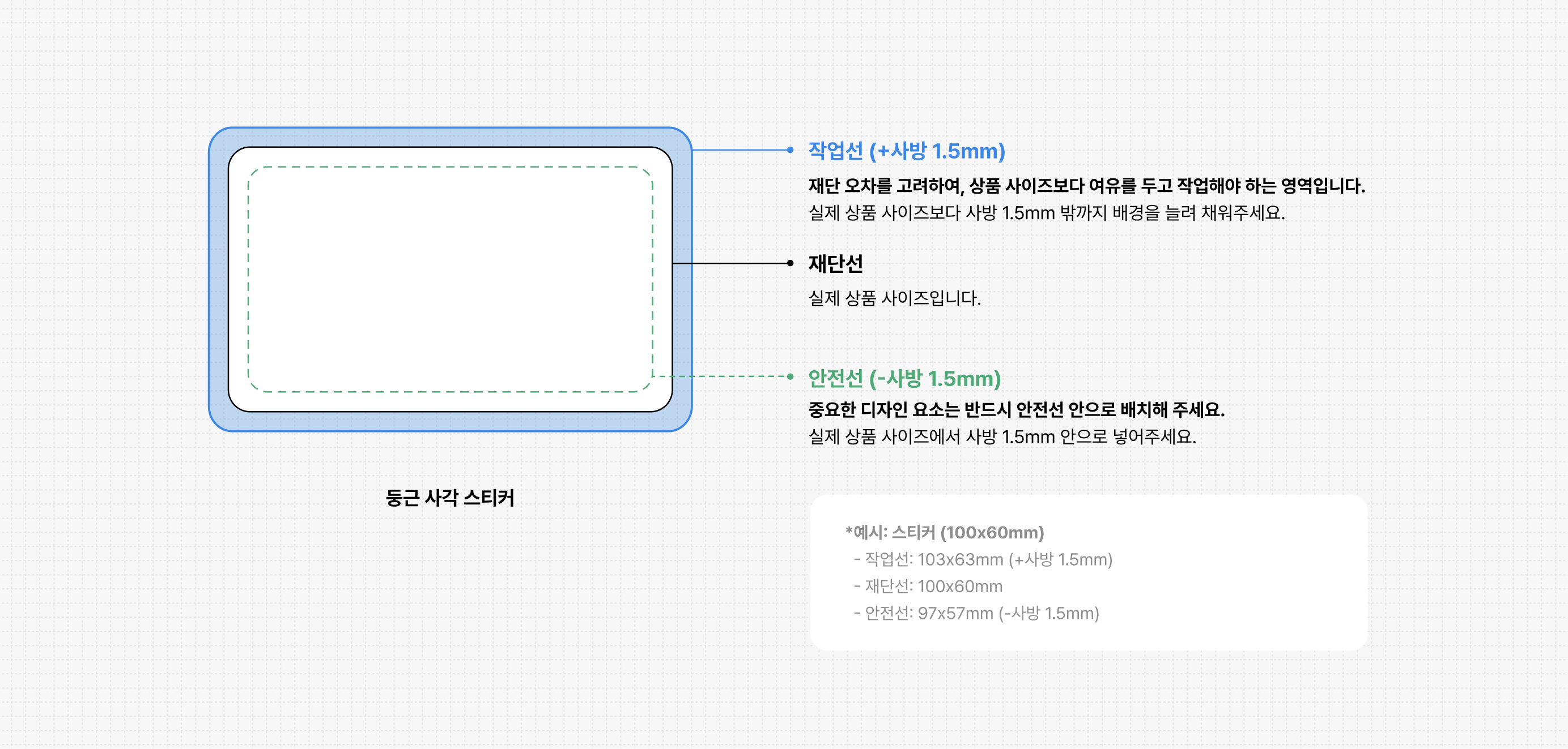 ・안전선: 글씨나 이미지가 잘려 나가지 않는 최소한의 안전한 영역으로, 중요한 디자인 요소는 반드시 안전선 안으로 배치해 주세요. ・안전선 밖으로 디자인할 경우, 재단 오차에 의해 잘려 나갈 수 있습니다. ・해당 유의사항을 확인하지 않고 발생하는 디자인 실수에 대해서는 재작업 및 반품이 불가합니다.