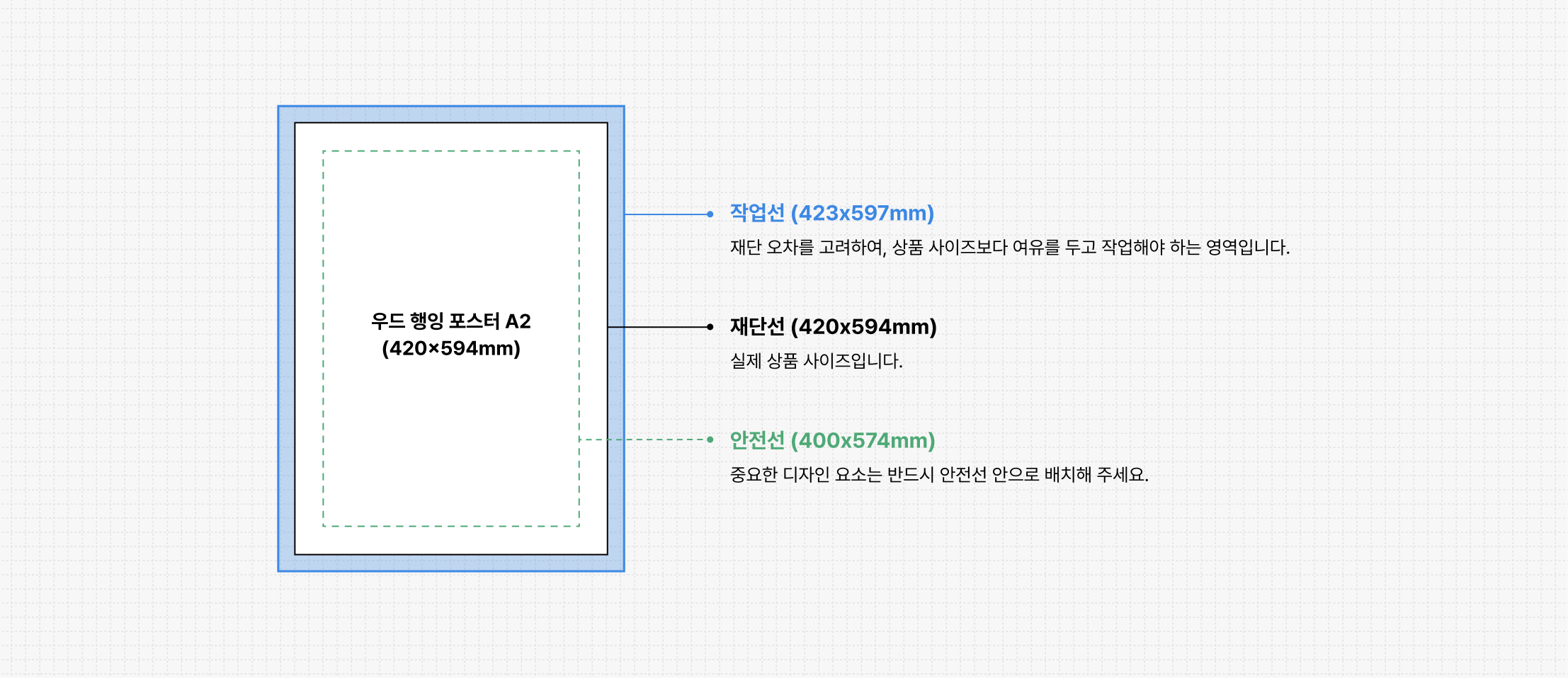 ・작업선: 재단 오차 및 후가공 작업을 고려하여, 상품 사이즈보다 여유를 두고 작업해야 하는 영역입니다. ・디자인 작업 시 재단선(상품 사이즈)보다 3~5mm 여유롭게 작업해 주셔야 배경이 밀리거나 잘리지 않습니다. (작업선에 맞춰 배경을 크게 채워주세요.) ・해당 유의사항을 확인하지 않고 발생하는 디자인 실수에 대해서는 재작업 및 반품이 불가합니다.