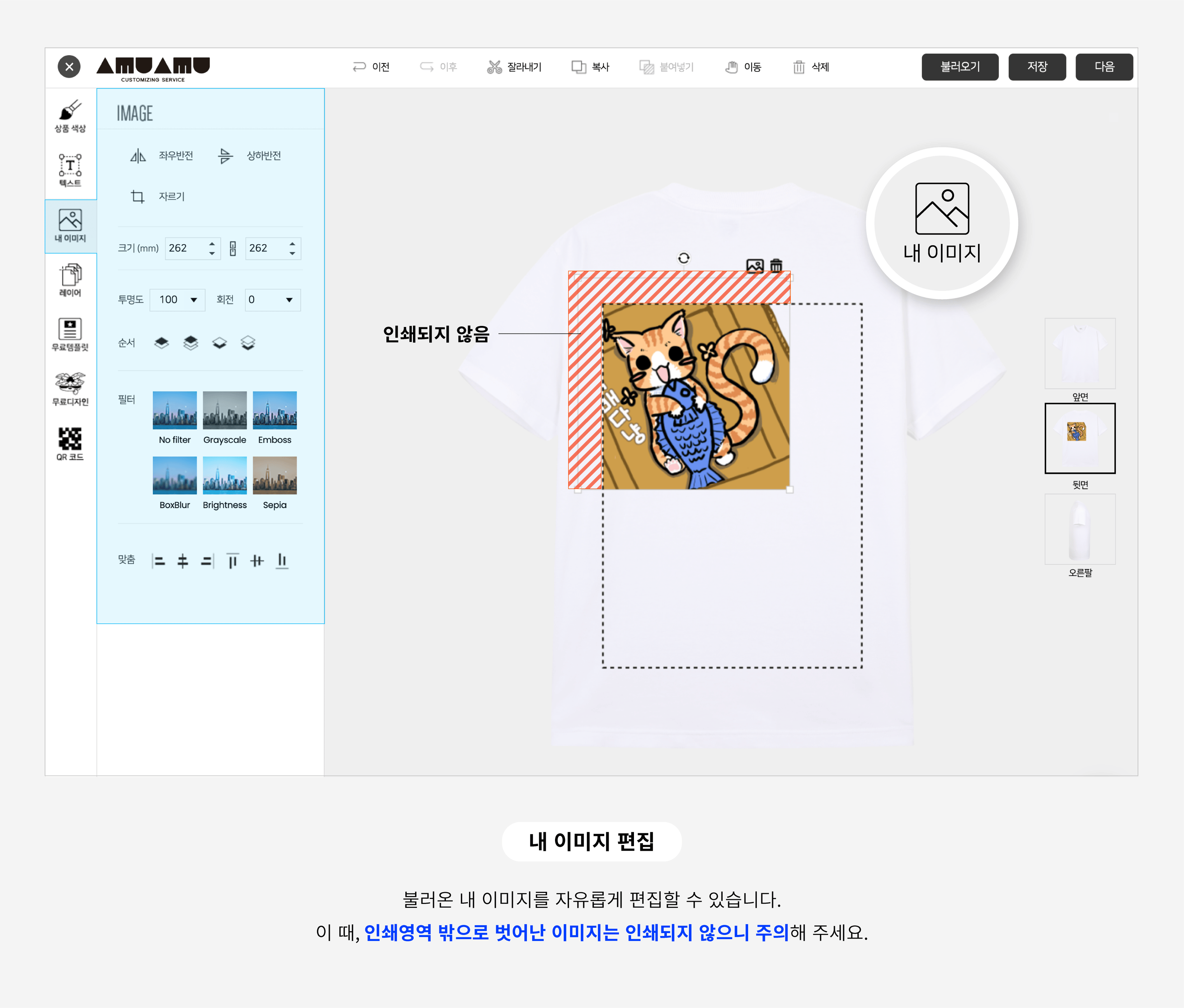 - 프린팅 방식과 상품 원단에 따라, 인쇄 후 모니터 화면과 실제 출력물의 색상 차이가 발생할 수 있으며 이에 대한 교환 또는 환불은 불가합니다.