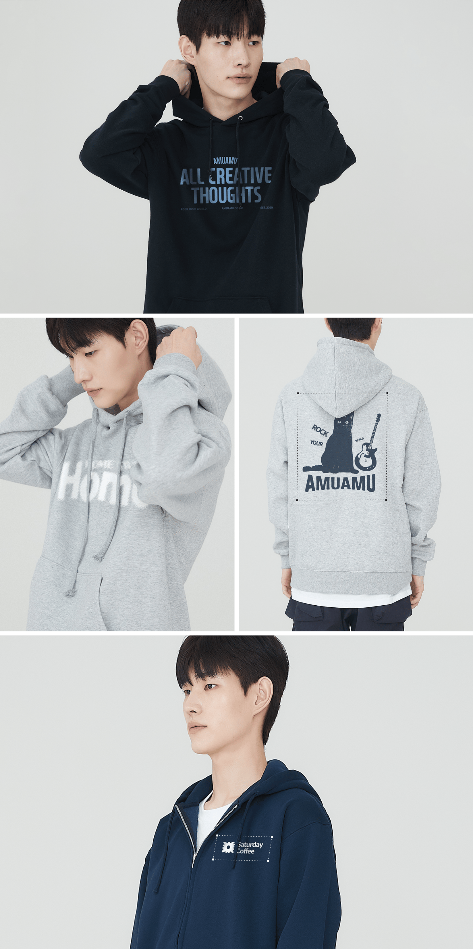 ・쭈리 원단: 부드러운 원단이 특징이며, 원단 뒷면이 작은 루프 형태로 짜여 있어 통기성이 높고, 내구성이 좋습니다. ・기모 원단: 원단 뒷면에 기모 공정을 하여, 부드럽고 도톰한 두께감을 만들어 따뜻하게 입을 수 있습니다.
