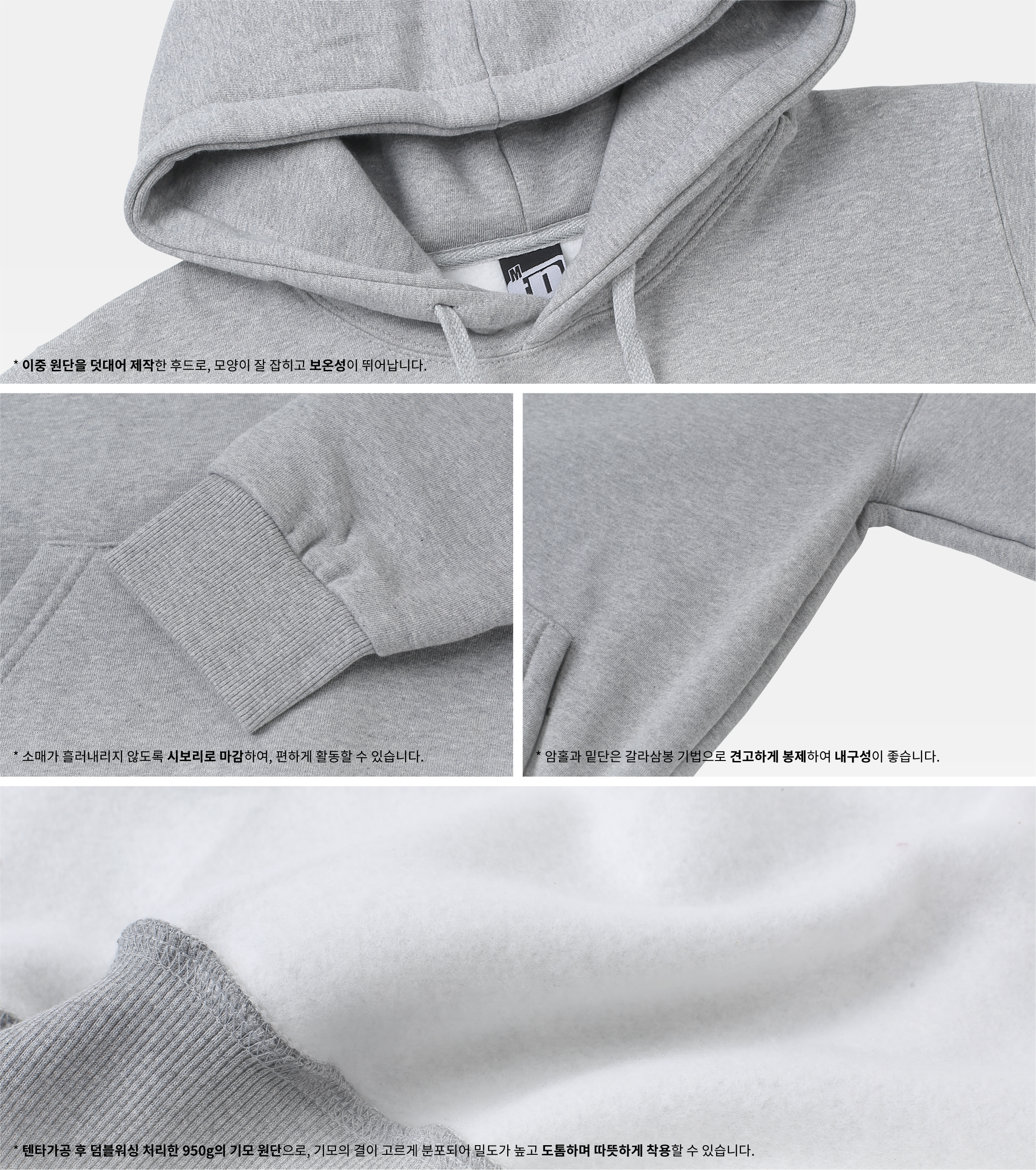 - 일반 기모 후드보다 더 도톰한 950g 중량으로 제작되어 포근하고 따뜻해요. 국내에서 생산된 프리미엄 기모 원단에 핏감을 좋게 만드는 견고한 봉제로 튼튼하며, 여유로운 핏감으로 캐주얼하게 착용할 수 있어요. 텐타가공 및 덤블워싱 공정을 거쳐 내구성을 높여, 변형과 수축이 적은 후드입니다.